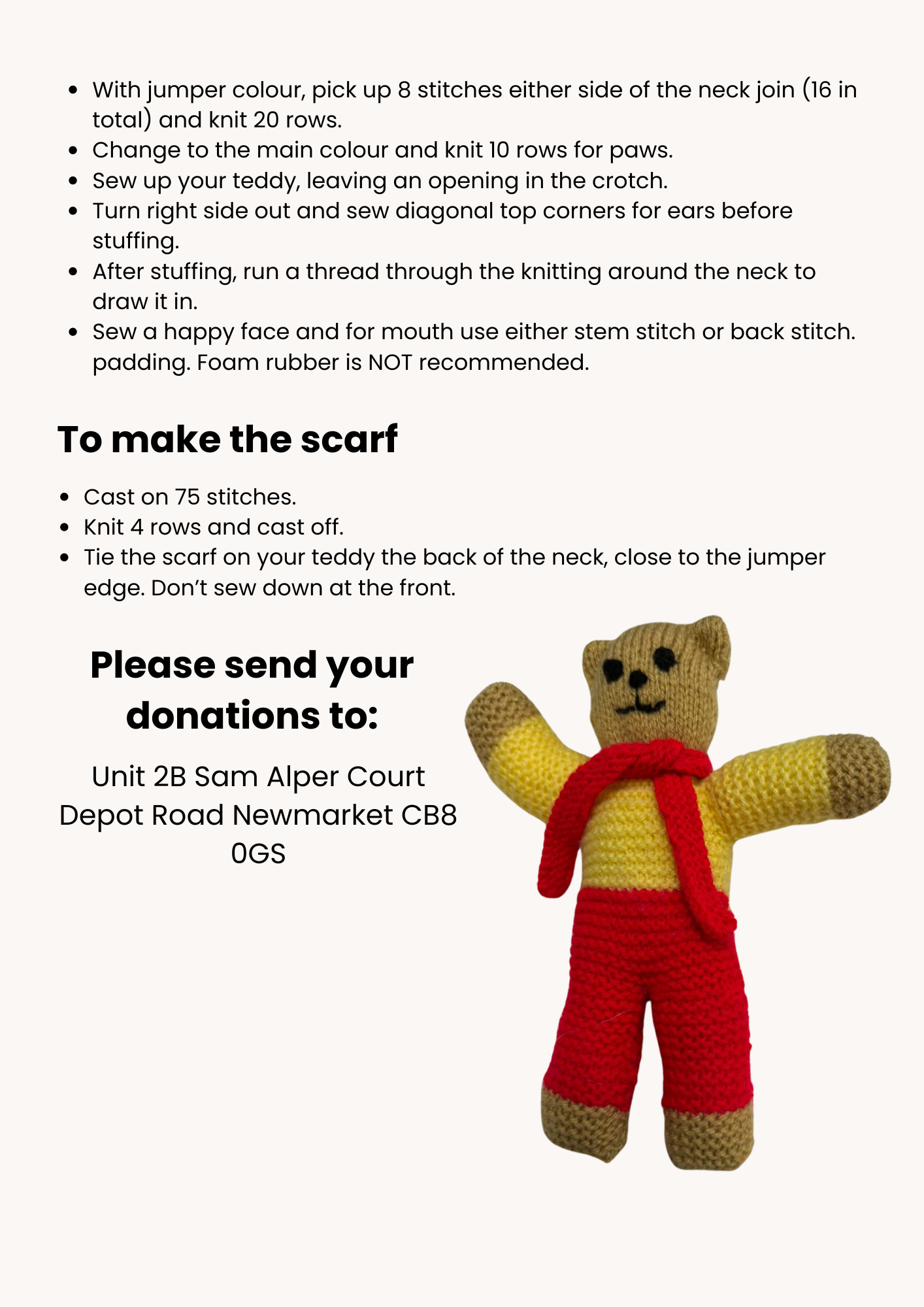 - Knit: If you have a talent for knitting, then we are welcoming donations of knitted teddies. Teddies can be sent to our office – Unit 2B, Sam Alper Court, Depot Road, Newmarket, CB8 0GS